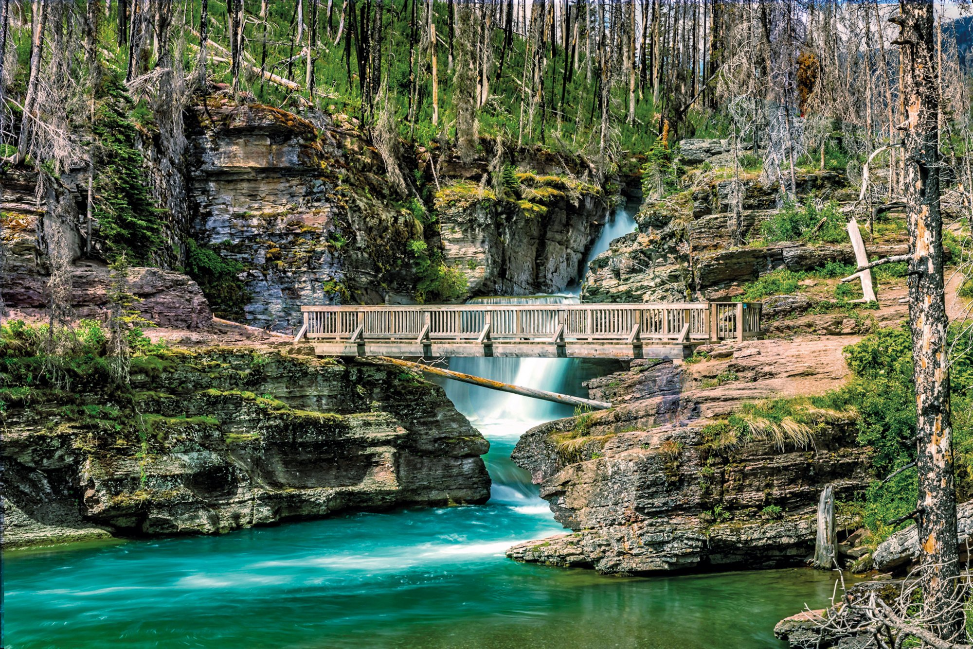 Οι καταρράκτες, τα κρυστάλλινα νερά των παγετώνων, τα βράχια, τα ψηλά δέντρα και ένα ξύλινο γεφύρι, καλόγουστη παρέμβαση του ανθρώπου στο πυκνό δάσος: Μία από τις εικόνες που συναντάς συχνά περπατώντας στη φύση της Μοντάνα.