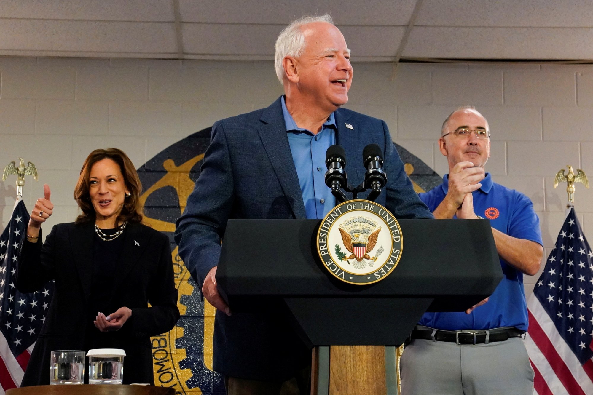 Η επιλογή του χαρισματικού 59χρονου κυβερνήτη της Μινεσότα, Τιμ Γουόλς, για τη θέση του υποψήφιου αντιπροέδρου έχει δώσει νέα ώθηση στην προεκλογική καμπάνια της Κάμαλα Χάρις. / Φωτ.: REUTERS/Elizabeth Frantz