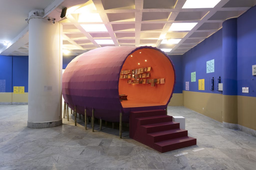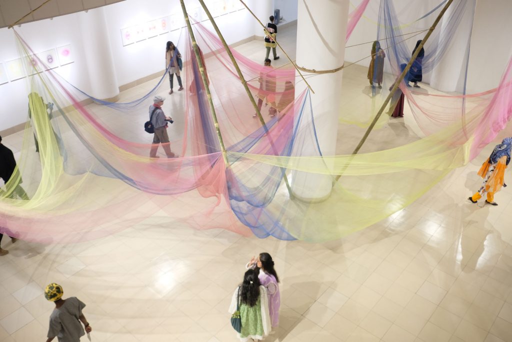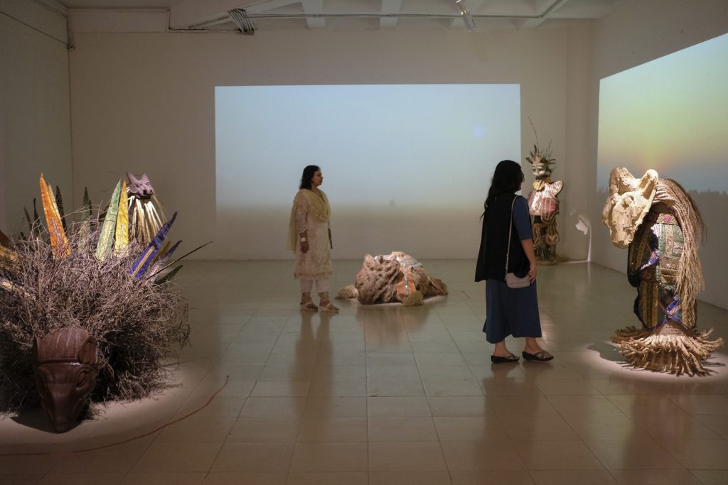 «Αποστέλλουμε όσο λιγότερα έργα μπορούμε και προσπαθούμε οι επιμέλειες των εκθέσεων να αφορούν το δικό μας πλαίσιο αντί να τις μετατρέπουμε σε “συνθήκες δυτικού μουσείου” που περιλαμβάνουν την ανάγκη για κλιματισμό και άλλες μη φιλικές προς το περιβάλλον πρακτικές. Τα υλικά που χρησιμοποιούμε για την παραγωγή των έργων και των εκθέσεων προέρχονται κυρίως από την περιοχή και τα περισσότερα ανακυκλώνονται μετά το πέρας της έκθεσης. Νομίζω ότι είναι σημαντικό για τους ανθρώπους να δουν από κοντά το Μπανγκλαντές, το οποίο είναι γνωστό ως το “σημείο μηδέν για την κλιματική αλλαγή”, ώστε να κατανοήσουν τις συνέπειες που έχει το περιβαλλοντικό τους αποτύπωμα σε ανθρώπους στην άλλη άκρη του κόσμου, αλλά και να εμπνευστούν από το παράδειγμα δημιουργικών επαγγελματιών στο Μπανγκλαντές που χτίζουν ενάντια στην κλιματική αλλαγή με ελπιδοφόρους τρόπους».