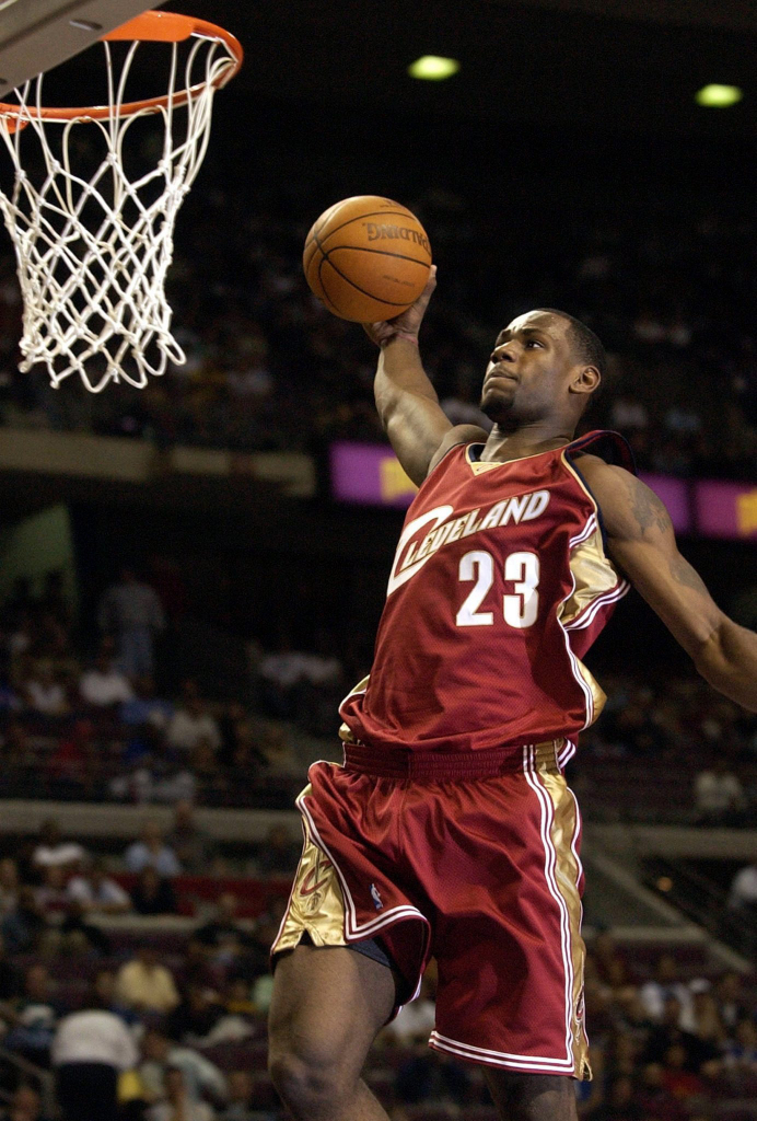 Ο 19χρονος Λεμπρόν Τζέιμς καρφώνει στο καλάθι των Ντιτρόιτ Πίστονς στον πρώτο του φιλικό αγώνα στο NBA τον μακρινό Οκτώβριο του 2003.