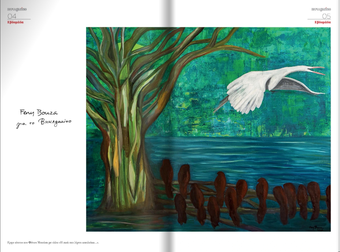 Στο έργο της Φένυς Μπούζα, η ζωή στη λίμνη μπορεί να σβήνει, μπορεί τα πουλιά να αντιλαμβάνονται και να σωματοποιούν τον όποιο κίνδυνο, μπορεί το δέντρο να στέκει δίχως φύλλα, όμως η αισιοδοξία είναι ηχηρά παρούσα.
