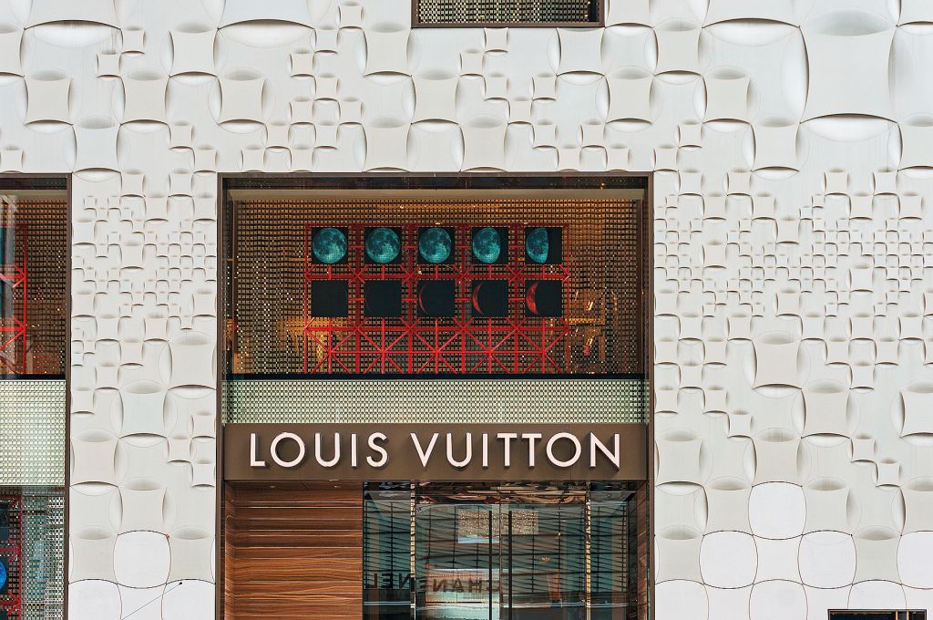 Aντίστοιχα, στο Τόκιο και στην πολυσύχναστη Γκίνζα με τις πολυτελείς ναυαρχίδες του shopping, το επταώροφο κατάστημα του brand στην οδό Namiki αναγεννήθηκε χάρη στη συνεργασία των Αόκι και Μαρίνο. Ο ιάπωνας αρχιτέκτονας «τύλιξε» με νερό το κτίριο που βρισκόταν στη συγκεκριμένη θέση από το 1981, με την πρόσοψή του να θυμίζει υδάτινους κυματισμούς και τη χρήση διχρωμικού γυαλιού να ενισχύει αυτή την ψευδαίσθηση. Στην ίδια μητρόπολη και την ίδια εμπορική περιοχή ένα κατάστημα LV δεν είναι ποτέ αρκετό, συνεπώς ο Αόκι είχε επιμεληθεί από το 2013 και την πρόσοψη της μπουτίκ που εφάπτεται στο γνωστό Matsuya Ginza department store. Σε αυτή την περίπτωση, ο Αόκι δημιούργησε ένα ανάγλυφο που παραπέμπει τόσο σε μοτίβα της art deco – ένα κλείσιμο του ματιού στην αντίστοιχη αρχιτεκτονική παράδοση της πόλης – όσο και των edo komon, των διακοσμητικών στοιχείων που έφερε η στολή των σαμουράι, παραπέμποντας ταυτόχρονα στο χαρακτηριστικό damier (μοτίβο σκακιού) του πολυτελούς οίκου. Το κτίριο αλλάζει την όψη του στη διάρκεια της ημέρας μέσα από τις φυσικές εναλλαγές φωτός και σκιάς, κάτι που συνεχίζεται και το βράδυ με τη συνδρομή φωτιστικών πηγών LED.