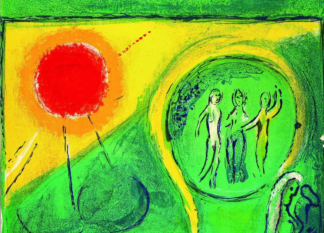 Ενας γαμπρός αιωρείται πάνω από τις στέγες, μια νύφη σκύβει τρυφερά προς το φως, ενώ ένας τεράστιος ήλιος, σαν μυστικό που αποκαλύπτεται μόνο σε όσους μπορούν να ονειρεύονται, κατακλύζει τον ορίζοντα. Εραστές πετούν, ζώα μιλούν, τα λουλούδια πολλαπλασιάζονται σε χρωματικές εκρήξεις. Η πραγματικότητα και το όνειρο δεν συγκρούονται αλλά απλώς συνυπάρχουν, αβίαστα, σαν να ήταν ανέκαθεν προορισμένα να συναντηθούν στη ζωγραφική του Μαρκ Σαγκάλ (1887-1985).