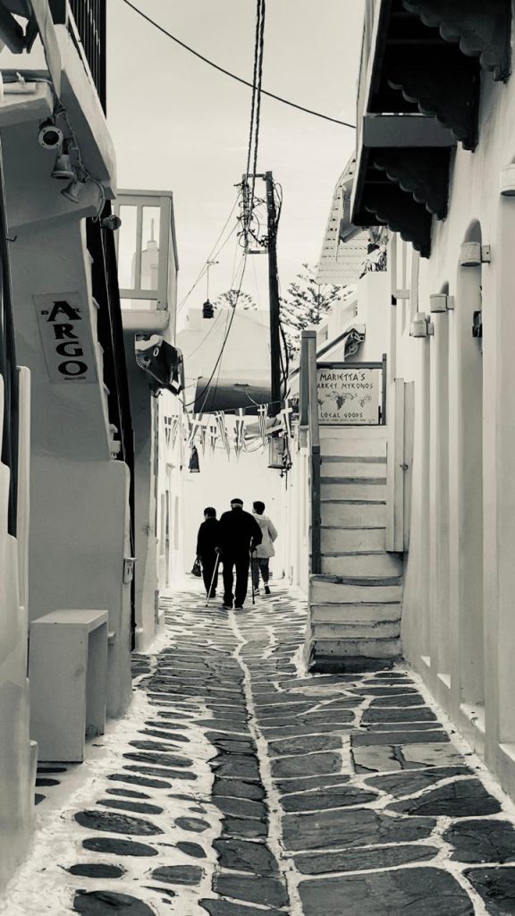Αντίκρισα πάνω στα μπάζα σε δύο καρέκλες τη μάνα μου και τον πατέρα μου να κοιτάνε προς το πέλαγος μ’ ένα γαλήνιο κι ευχαριστημένο βλέμμα που με τρόμαξε. Οταν τους ρώτησα «μα τι κάνετε εδώ;» μου απάντησαν: «Σε περιμένουμε, είναι όλα έτοιμα, δες τι ωραία που τα έχουμε!». Το πρωί θέλησα να καταγράψω τον εφιάλτη. Προέκυψε όμως ένα άλλο κείμενο, ενδεικτικό αυτού που συμβαίνει στο νησί. Μια σχιζοφρενική κατάσταση ξετρελαίνει τους Μυκονιάτες όταν μένουν τον χειμώνα στον τόπο τους και δεν μετακομίζουν στο διαμέρισμα της οδού Πατησίων ή όταν δεν οργανώνονται για εξόρμηση στην Ταϊλάνδη.