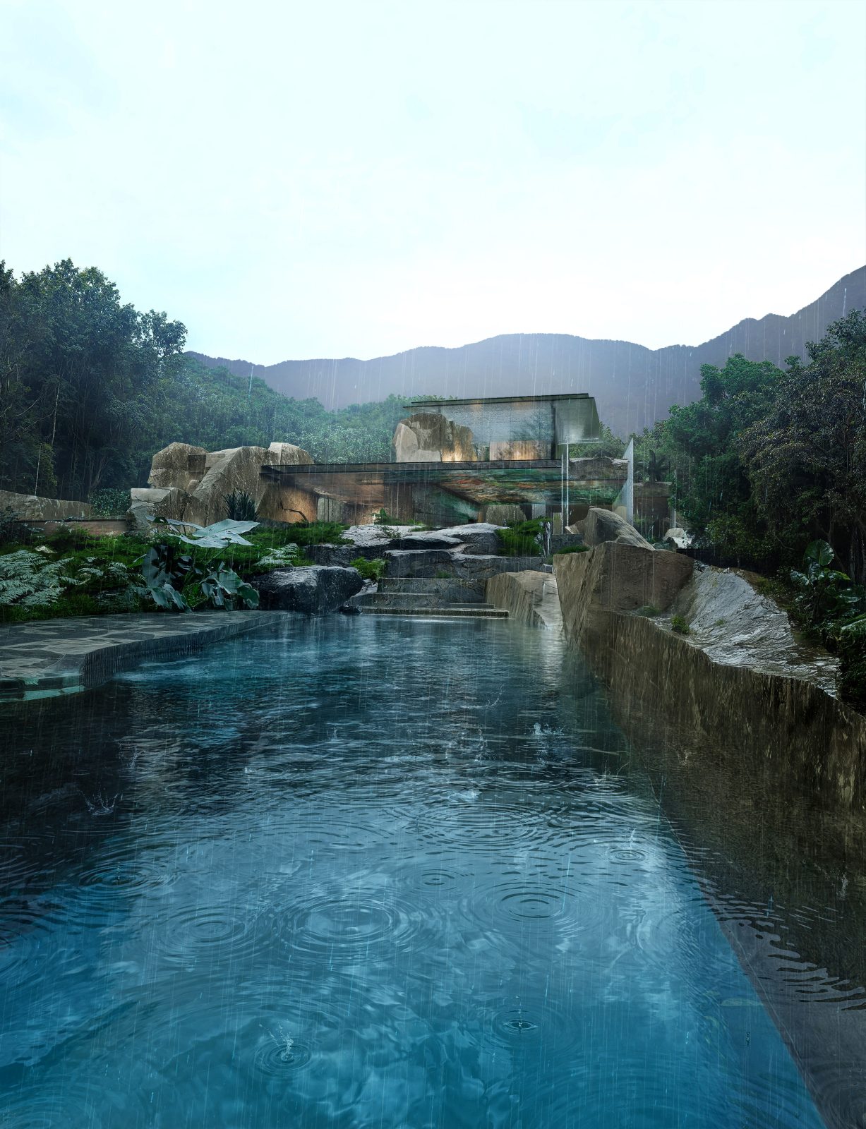 Το κτίριο που σχεδίασε ο Ζαν Νουβέλ, ο «μάγος του φωτός» όπως συχνά αποκαλείται, γνωστός για την ποιητική υπόσταση της αρχιτεκτονικής του, διαλύει τα όρια μεταξύ πραγματικού και φανταστικού. Το κτίριο διεγείρει τις αισθήσεις, καθώς ο ήχος της βροχής, η ομίχλη, ο ήλιος, ο αέρας γίνονται μέρος της εμπειρίας κατοίκησής του. Το κατάλυμα, κατασκευασμένο από πέτρα και γυαλί, αποτελεί μια εντυπωσιακή δομή που μοιάζει να αναδύεται μέσα από το έδαφος αντανακλώντας το τοπίο γύρω της. Αντλώντας έμπνευση από το ανάγλυφο της φύσης, ο αρχιτέκτονας εκμεταλλεύτηκε τις ποιότητες των υλικών για να δημιουργήσει υδάτινους αντικατοπτρισμούς, να αποκαλύψει αιθέρια τοπία, να επιτρέψει σε όποιον το κατοικεί να απομονωθεί και να βυθιστεί στον εαυτό του. Σε έναν τόπο που παραμένει ανόθευτος, ο βραβευμένος με Pritzker Ζαν Νουβέλ εγείρει μια σειρά αισθητηριακών εμπειριών από τον περιβάλλοντα χώρο που η κατοίκηση συνήθως αφήνει αδρανείς ή ακόμα και τις καταστέλλει (νερό, αέρας κ.ά.).