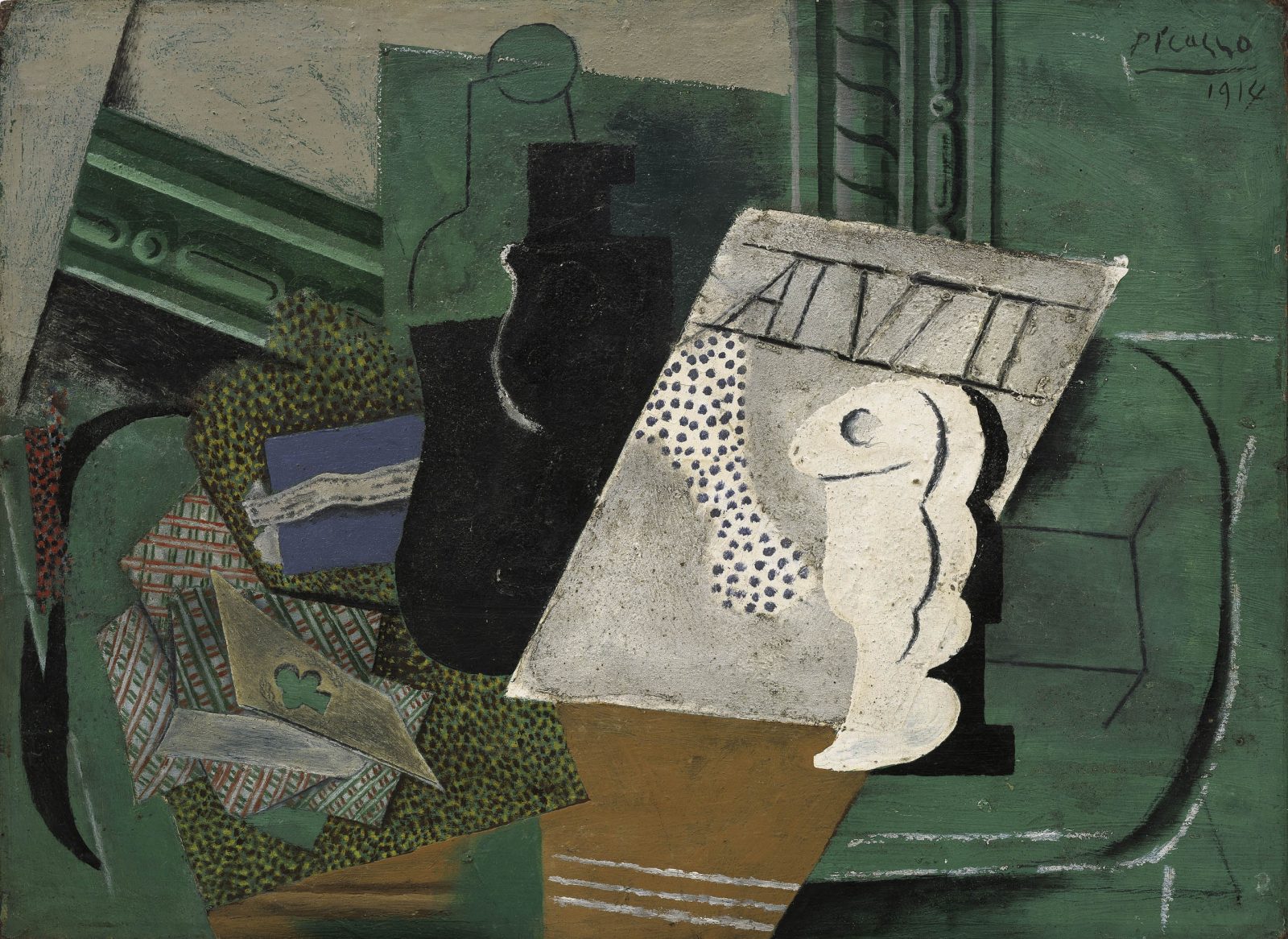 Mια «Νεκρή φύση» του 1914, όπου υλικά όπως εφημερίδες, πριονίδι και τραπουλόχαρτα γίνονται μέρος της σύνθεσης, αποτελεί σημείο καμπής για την πορεία του και βάζει τα θεμέλια για τον Συνθετικό Κυβισμό. Ο Πικάσο δεν αναπαριστά απλώς τα αντικείμενα αλλά τα μετατρέπει σε γλώσσα, σε σύμβολα της ανθρώπινης εμπειρίας.