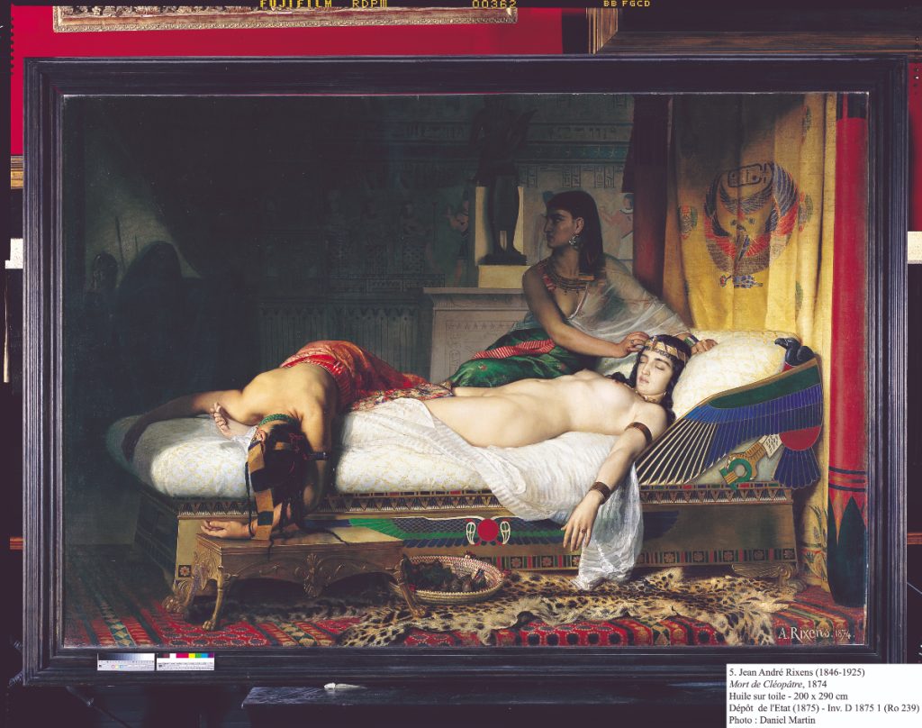 Στη ζωγραφική η Κλεοπάτρα μετατρέπεται από ρομαντική ηρωίδα σε εξωτική και γραφική φιγούρα: τόσο στον ζωγράφο της Αναγέννησης και του Μανιερισμού Μικέλε Τοζίνι (1503-1577) όσο και τον γάλλο ζωγράφο Ζαν-Αντρέ Ριξάνς (1846-1925) συναντάμε με τρεις αιώνες διαφορά την ίδια νοσηρή αισθησιακότητα.