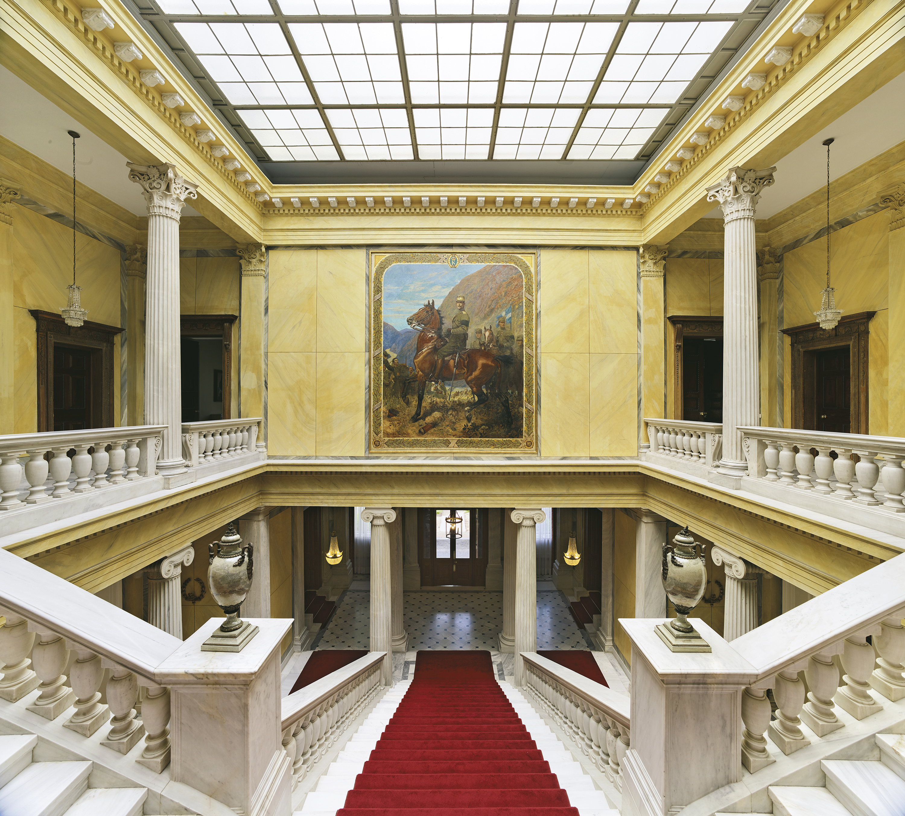 Ανεβαίνοντας στον πρώτο όροφο και αντίθετα με ό,τι θα περίμενε κανείς, το επιβλητικό κλιμακοστάσιο δεν οδηγεί σε χώρους υποδοχής εξίσου επιβλητικούς, αλλά σε δωμάτια σαφώς μικρότερα από αυτά αθηναϊκών μεγάρων που είχε σχεδιάσει ο Τσίλλερ. Αυτό όμως που μπορεί να δει κανείς από ψηλά ανεβαίνοντας είναι ο μόνος πίνακας-τοιχογραφία του παλαιότερου διάκοσμου που σώζεται σήμερα μέσα στο Μέγαρο. Είναι έργο του γάλλου πολεμικού ανταποκριτή και ζωγράφου Ζορζ Σκοτ, ο οποίος τον φιλοτέχνησε το 1914. Απεικονίζει σε πρώτο πλάνο τον βασιλιά Κωνσταντίνο έφιππο στρατηλάτη και πίσω του τους αδελφούς του, Γεώργιο, Νικόλαο και Χριστόφορο. Σημειωτέον ότι ο εσωτερικός διάκοσμος και τα έπιπλα του κτιρίου δεν έχουν διασωθεί και δεν υπάρχουν εικόνες από τις επιλογές διακόσμησης κατοίκων του όπως η Σοφία, ο Γεώργιος Β’, ο Παύλος και η Φρειδερίκη. Τα έργα τέχνης, όπως πίνακες του Θεόδωρου Βρυζάκη, του Κωνσταντίνου Βολανάκη ή του Νίκου Χατζηκυριάκου-Γκίκα και οι εικόνες στους τοίχους του σήμερα είναι δάνεια διαρκείας από την Εθνική Πινακοθήκη, το Μουσείο Μπενάκη και το Βυζαντινό και Χριστιανικό Μουσείο.