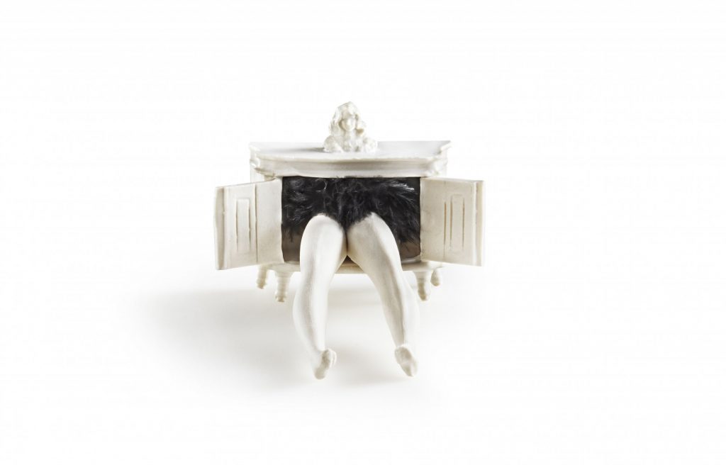 Αν μη τι άλλο, υπάρχει χρόνος, καθώς η διαδικασία μέχρι να ολοκληρωθεί το έργο είναι σύνθετη και χρονοβόρα. «Ξεκινά με την κατασκευή γύψινων καλουπιών αντικειμένων που έχω επιλέξει για να συνθέσω την τελική μορφή του έργου. Στη συνέχεια χυτεύω σε αυτά υγρή πορσελάνη, την οποία παρασκευάζω. Αφού περάσει ο χρόνος που απαιτείται για να στερεοποιηθεί το υλικό, χωρίς να στεγνώσει και να χάσει την πλαστικότητά του, αποσπώ τα παράγωγα της χύτευσης, τα αποδομώ και ανασυνθέτω τα μέλη που χρειάζομαι, σαν τρισδιάστατο κολλάζ. Οταν το έργο πάρει την τελική του μορφή ψήνεται σε καμίνι, μετά υαλώνεται και ξαναψήνεται σε υψηλότερη θερμοκρασία, ώστε να αποκτήσει την τελική επιφάνεια της πορσελάνης».