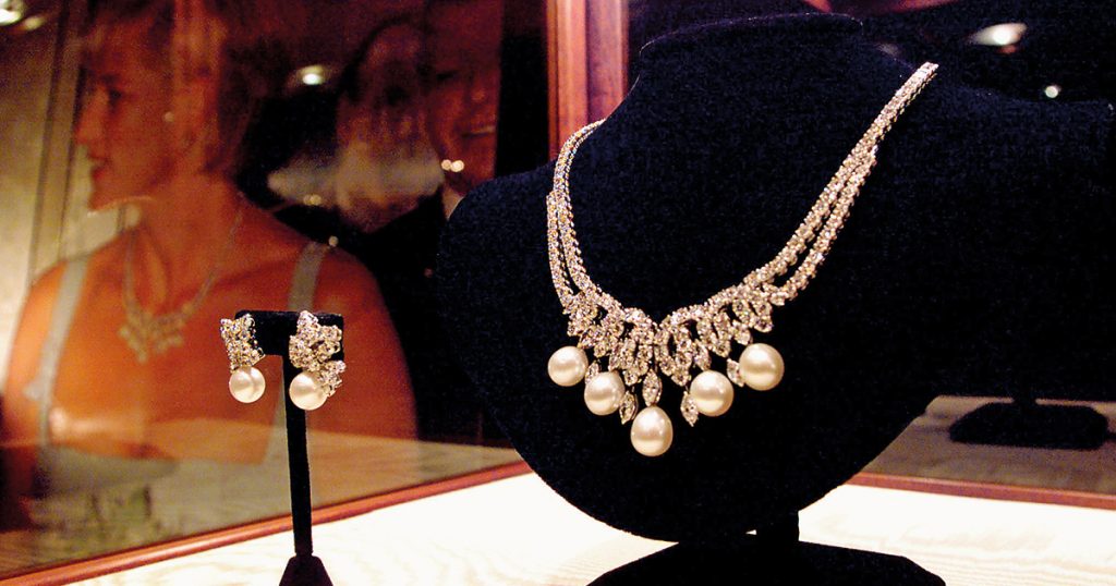 Ένα ζευγάρι σκουλαρίκια και ένα κολιέ με πέρλες και διαμάντια που είχαν φορεθεί από την πριγκίπισσα Νταϊάνα στην τελευταία της επίσημη εμφάνιση τον Ιούλιο του 1997, εκτίθενται πριν δημοπρατηθούν στη Νέα Υόρκη.