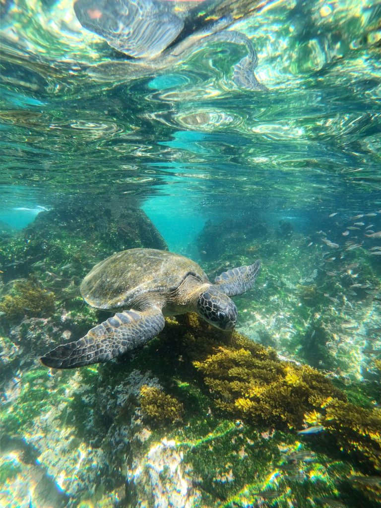 Τα ακολούθησα με δέος, προσπαθώντας ταυτόχρονα να διατηρήσω την ηρεμία μου για να τραβήξω καθαρές φωτογραφίες. Σε βάθος 15 μέτρων, με ισχυρά ρεύματα γύρω μας, βρέθηκα περικυκλωμένη από αυτά τα επιβλητικά πλάσματα. Κολυμπήσαμε μαζί για λίγα πολύτιμα λεπτά και ήταν σαν να πετούσα δίπλα σε αρχαίους θαλάσσιους αγγέλους.