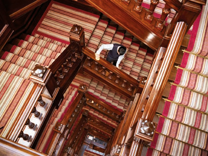 Η ιστορική ξύλινη σκάλα του lobby αποτελεί σήμα κατατεθέν του ξενοδοχείου.