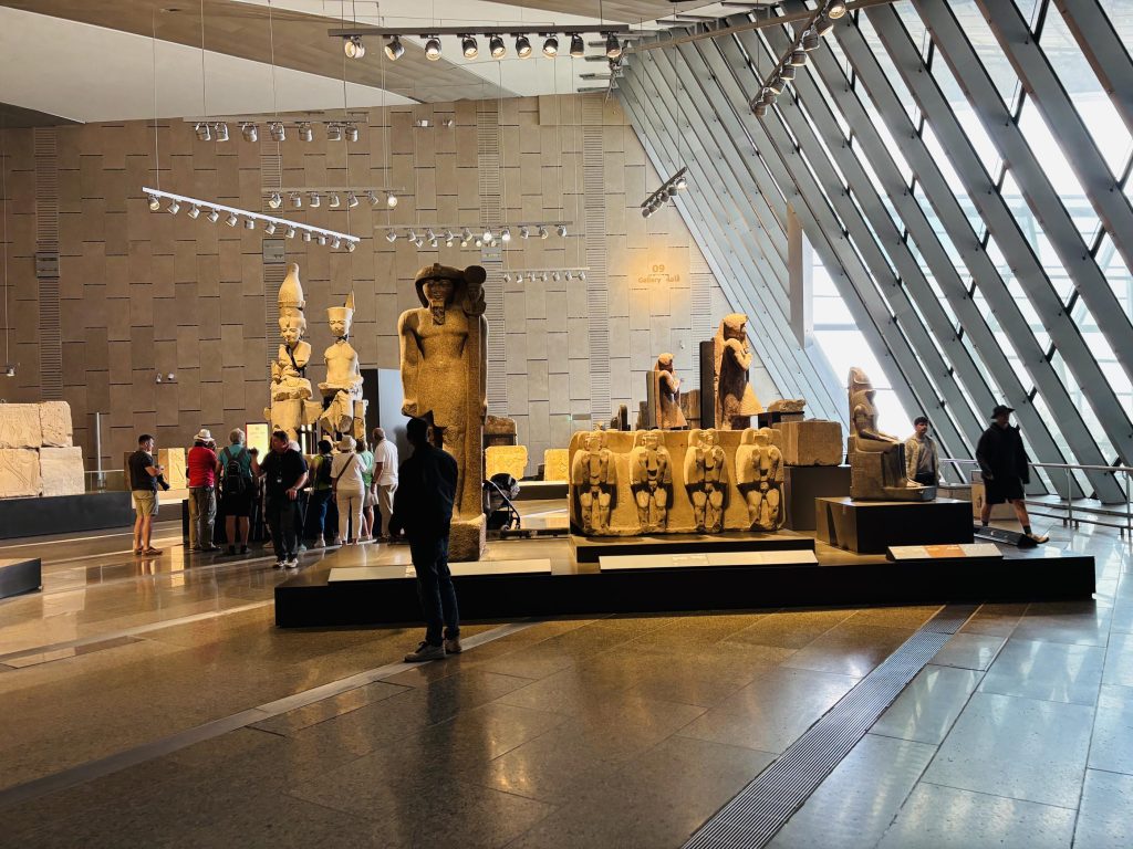 Ολοι οι χώροι είναι μεγάλοι και άνετοι ώστε να μην στριμώχνονται ούτε τα εκατοντάδες εκθέματα ούτε οι επισκέπτες. Αγάλματα, μεγάλα και μικρά, σαρκοφάγοι, επιφάνειες με ιερογλυφικά, σκεύη οικιακής χρήσης, αντικείμενα καλλωπισμού, γλυπτά, ξυλόγλυπτα, πάπυροι, βασιλικοί θησαυροί και αντικείμενα που ανήκαν σε απλούς ανθρώπους διηγούνται, το ένα δίπλα στο άλλο, τη δική τους ιστορία και όλα μαζί τη λαμπρή ιστορία ενός μοναδικού λαού, με τη βοήθεια των εξαιρετικών, σύντομων, κατατοπιστικών σημειωμάτων που τα συνοδεύουν. Από τα ανοίγματα στο ταβάνι μπαίνει φως, ενίοτε δέσμες (αποτέλεσμα και του παιχνιδιού του ήλιου με τα σύννεφα) που πέφτουν με τρόπο μεταφυσικό, τη μια πάνω στο μπούστο μιας γυναικείας μορφής, την άλλη στο πρόσωπο μιας Σφίγγας ή στις κολόνες με τα εκατοντάδες ιερογλυφικά. Από τα ανοίγματα στους τοίχους του μουσείου διακρίνονται οι πυραμίδες, με πιο εντυπωσιακή εκείνη του Χέοπα, ως υπενθύμιση πως η ιστορία συνεχίζεται εκεί έξω.