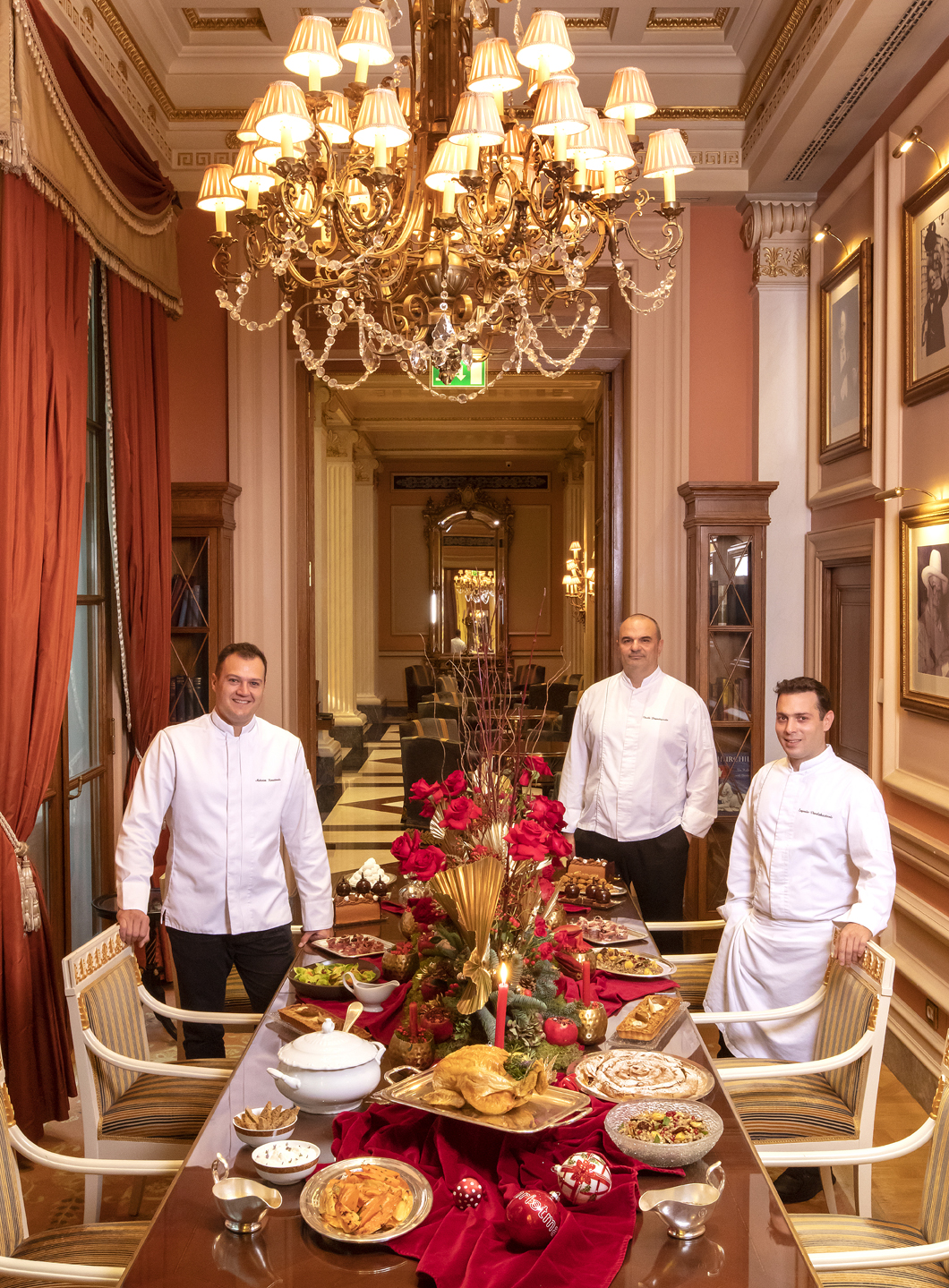 Ενα πλούσιο χριστουγεννιάτικο τραπέζι, με πιάτα φτιαγμένα μόνο για το BHMAgazino, στρώθηκε στην ιστορική, privé αίθουσα «Τσόρτσιλ» του ξενοδοχείου «Μεγάλη Βρεταννία», εκεί όπου ο ισχυρός άνδρας της Αγγλίας συνήθιζε να πραγματοποιεί τις συναντήσεις του στην Αθήνα. Ο εντυπωσιακός κόκκινος στολισμός του τραπεζιού με τα φρέσκα τριαντάφυλλα και τα αναμμένα κεριά ταίριαζε απόλυτα στο πολυτελές δωμάτιο που είναι γεμάτο με φωτογραφίες και προσωπικά αντικείμενα του βρετανού πολιτικού. Ταιριαστό ήταν και το μενού που ετοίμασε ο executive chef του ξενοδοχείου, Αστέριος Κουστούδης, μαζί με την άψογη μπριγάδα του, με τα φρέσκα, εποχικά υλικά να κυριαρχούν. Τα όμορφα γλυκά, στην όψη και στη γεύση, είναι προτάσεις του chef patissier Ευγένιου Βαρδακαστάνη.