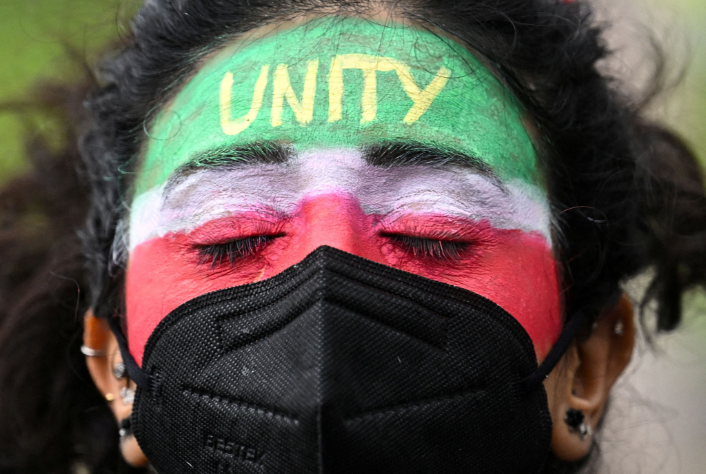 Διαδηλώτρια στο Λονδίνο σε συγκέντρωση συμπαράστασης στους νέους που έχουν κατακλύσει τους δρόμους του Ιράν.