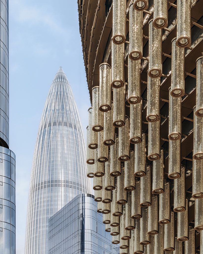 Ενα από τα πιο εντυπωσιακά στοιχεία του έργου είναι η σχεδόν ανάγλυφη πρόσοψη, η οποία αποτελείται από κάθετα τοποθετημένους αλλεπάλληλους γυάλινους σωλήνες που μοιάζουν να αιωρούνται. Η παραμετρική σχεδίαση επιτρέπει την εναλλαγή πυκνότητας και βάθους, δημιουργώντας ένα δυναμικό περίβλημα που μεταβάλλεται ανάλογα με το φως της ημέρας.