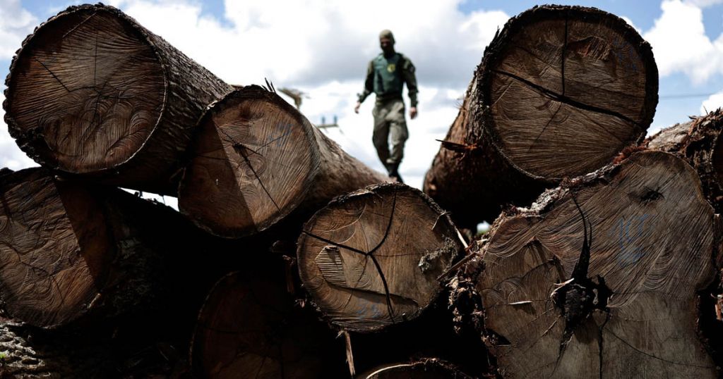 Εργαζόμενος του Ινστιτούτου για το Περιβάλλον και τις Ανανεώσιμες Πηγές επιθεωρεί κορμούς κομμένους από το δάσος της βροχής σε πριονιστήριο.