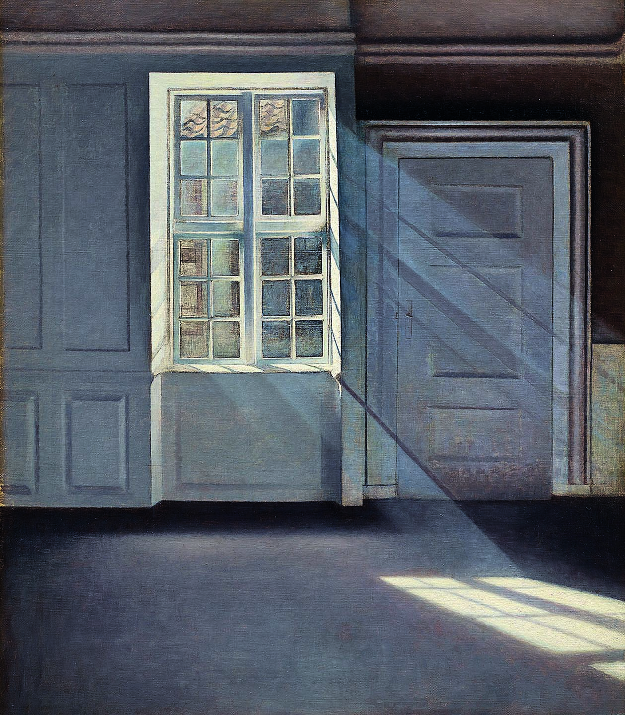 Διότι ο Χάμερσχοϊ μπορεί να ζωγράφισε πολλά πορτρέτα αλλά και τοπία, όμως η καλλιτεχνική πορεία του είναι στενά συνδεδεμένη με το διαμέρισμά του στη Strandgade 30, στην περιοχή Christianshavn της Κοπεγχάγης. Εκεί ζούσε μαζί με την Ιντα, ανάμεσα σε μινιμαλιστικά επιπλωμένα δωμάτια και ουδέτερα όσο και γήινα χρώματα, σε ένα αυστηρό περιβάλλον, ιδανικό για να εξερευνήσει τη γεωμετρία και τις μεταβολές του φωτός εντός του. Με το βόρειο φως, διάχυτο και απαλά φωτεινό, να διαπερνά τα παράθυρα και να αντανακλάται στις επιφάνειες, είδε έναν τρόπο να αποκαλύψει τις γραμμές και τις γωνίες των δωματίων. Η χρωματική παλέτα μπορεί να φαίνεται περιορισμένη, αλλά κάθε παρατήρηση φέρνει στο φως λεπτές αποχρώσεις μπλε, πράσινου ή κοβαλτίου, που δίνουν ζωή στους χώρους και στα αντικείμενα και δημιουργούν αίσθηση αιώρησης, στοχασμού και ενδοσκόπησης.