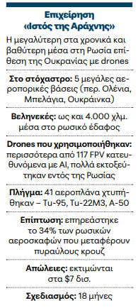 Συνολικά καταστράφηκε το 34% των ρωσικών στρατηγικών αεροσκαφών που μεταφέρουν πυραύλους τύπου κρουζ, τα οποία, από την αρχή της εισβολής, έχουν εκτοξεύσει περισσότερους από 3.000 τέτοιους πυραύλους εναντίον μη στρατιωτικών στόχων και υποδομών στην Ουκρανία, εκτιμά η Βορειοατλαντική Συμμαχία. Οπως λένε υψηλόβαθμα στελέχη της, η περίπλοκη αυτή επιχείρηση ανέδειξε τα τρωτά σημεία της Ρωσίας «σε μια στιγμή που ο Πούτιν θεωρεί ότι κερδίζει τον πόλεμο». Η Μόσχα αμφισβητεί τους ισχυρισμούς ότι η Ουκρανία κατάφερε να καταστρέψει τα στρατηγικά βομβαρδιστικά αεροσκάφη της, λέγοντας πως έχουν υποστεί ζημιές που μπορούν να αποκατασταθούν.