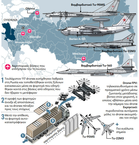 Λίγες ώρες αργότερα το Κίεβο ανακοινώνει επίσημα πως εξαπέλυσε συντονισμένη επίθεση εναντίον τεσσάρων ρωσικών αεροπορικών βάσεων: την Ολένια στην περιφέρεια του Μούρμανσκ μέσα στον Αρκτικό κύκλο, την Μπέλαγια στη Σιβηρία, που απέχει 4.000 χιλιόμετρα από τα σύνορα με την Ουκρανία, καθώς και το Ντιαγκιλέβο και το Ιβάνοβο, όχι μακριά από τη Μόσχα.