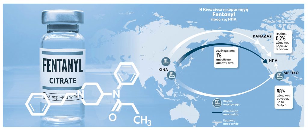 Σύμφωνα με την αμερικανική Yπηρεσία Δίωξης Ναρκωτικών (DEA) και το αμερικανικό υπουργείο Δικαιοσύνης, από το 2019 ο κύριος όγκος του Fentanyl που φθάνει στις ΗΠΑ παρασκευάζεται στο Μεξικό χάρη σε κινεζικές «πρόδρομες ουσίες» – οι χημικές ουσίες που μετά από επεξεργασία και προσθήκες συνθέτουν το φάρμακο. Η Κίνα και το Μεξικό διαδραματίζουν όντως σημαντικό ρόλο στη διακίνηση του Fentanyl στις ΗΠΑ, όχι όμως και ο Καναδάς.