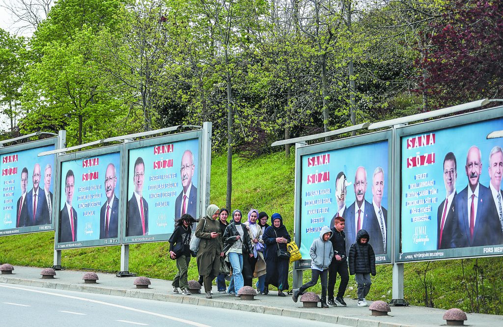 Πολίτες περνούν μπροστά από προεκλογικές αφίσες όπου δεσπόζει το πρόσωπο του ηγέτη της τουρκικής αντιπολίτευσης Κεμάλ Κιλιτσντάρογλου. Ο βουλευτής του φιλοκουρδικού HDP Σεζάι Τεµελί τονίζει ότι η υποστήριξη του κόμματός του στις εκλογές της επόμενης Κυριακής περιορίζεται αποκλειστικά στο πρόσωπο του Κιλιτσντάρογλου.