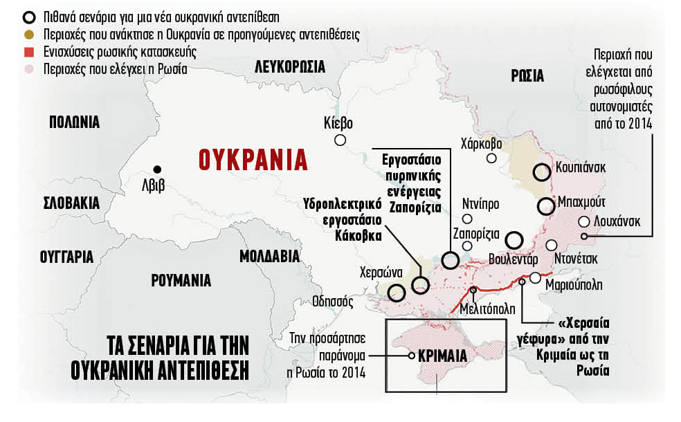 Δεκαπέντε σχεδόν μήνες μετά τη ρωσική εισβολή, οι περισσότεροι αναλυτές συμφωνούν ότι ο πόλεμος, με το τέλος του χειμώνα και τη βελτίωση των καιρικών συνθηκών, εισέρχεται σε κρίσιμο στάδιο. Αναπόσπαστο τμήμα του οποίου αποτελεί η αντεπίθεση των Ουκρανών. Σε τι συνίσταται όμως αυτή η αντεπίθεση; Η «Washington Post» παρουσίασε σχετικά σενάρια. Σύμφωνα με το πρώτο, η Ουκρανία κατορθώνει να «εμποδίσει» τη χερσαία σύνδεση μεταξύ της Ρωσίας και της, υπό ρωσική κατοχή, Κριμαίας, καταλαμβάνοντας το αντίστοιχο έδαφος και στερώντας έτσι από τους Ρώσους τη δυνατότητα να ενισχύουν τις δυνάμεις τους στην περιοχή της Ζαπορίζια (όπου βρίσκονται οι πυρηνικές εγκαταστάσεις της Ουκρανίας τις οποίες η Μόσχα ελέγχει από τις 4 Μαρτίου 2022) και απομονώνοντας τα ρωσικά στρατεύματα στην κριμαϊκή χερσόνησο.