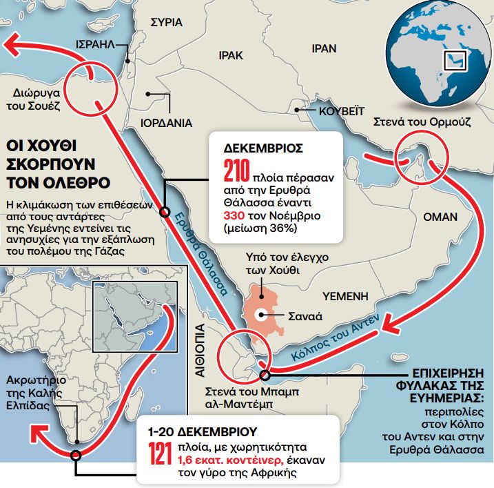 Η ασφάλεια στην Ερυθρά Θάλασσα είναι εξαιρετικά σημαντική για την παγκόσμια ναυσιπλοΐα, καθώς πρόκειται για έναν θαλάσσιο δρόμο που συνδέει την Ασία με την Ευρώπη και τις ΗΠΑ, με το 30% των παγκόσμιων μεταφορών εμπορευματοκιβωτίων να διέρχεται από εκεί. Τις τελευταίες ημέρες ωστόσο καθώς οι επιθέσεις των Χούθι πυκνώνουν επικίνδυνα, πολλές εταιρείες αποφάσισαν να αναστείλουν τις μεταφορές φορτίων. Αλλες χρησιμοποιούν εναλλακτικές διαδρομές κάνοντας τον γύρο της Αφρικής, ένα ταξίδι που διαρκεί δέκα με δεκαπέντε ημέρες περισσότερο, αυξάνοντας τα κόστη των μεταφορών, τις τιμές και τη διαθεσιμότητα των εμπορευμάτων, γεγονός που προκαλεί σημαντικές αναταράξεις στην παγκόσμια οικονομία.