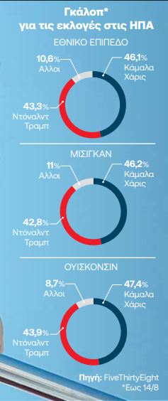Παρά ταύτα, το γεγονός ότι η Χάρις διατηρεί προβάδισμα έναντι του Τραμπ και σε κρίσιμες Πολιτείες όπως το Ουισκόνσιν (διαφορά 2,5%) και το Μίσιγκαν (διαφορά 3,4%) είναι ενθαρρυντικό. Οπως επίσης και το ότι σε σχέση με τα ποσοστά του Μπάιντεν, η Χάρις καταγράφει για τους Δημοκρατικούς τουλάχιστον δύο μονάδες περισσότερες σε καθεμία από τις επτά μεγάλες Πολιτείες (Αριζόνα, Τζόρτζια, Μίσιγκαν, Νεβάδα, Βόρεια Καρολίνα, Πενσιλβάνια και Ουισκόνσιν) οι οποίες ήταν καθοριστικές για τις εκλογές του 2020. Αναλύοντας τα στοιχεία των δημοσκοπήσεων, το «ρεύμα της Χάρις» οφείλεται στους μαύρους, στους ισπανόφωνους και στους λευκούς ψηφοφόρους, στους ψηφοφόρους ηλικίας κάτω των 45 ετών, σε όσους ψηφίζουν Δημοκρατικούς και σε όσους δηλώνουν ανεξάρτητοι.
