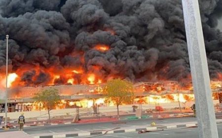 Η φωτιά ξέσπασε σε υπαίθρια αγορά (σουκ) στο Ατζμάν, με τον ουρανό της πόλης να γεμίζει με μαύρους καπνούς.