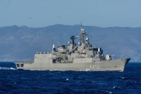 Πραγματοποιήθηκε η τελετή παράδοσης - παραλαβής της εν πλω διοίκησης της ευρωπαϊκής επιχείρησης «Ασπίδες» (EUNAVFOR ASPIDES), από τον Ιταλό υποναύαρχο Massimo Bonu στον Έλληνα αρχιπλοίαρχο Κωνσταντίνο Πιτυκάκη ΠΝ.