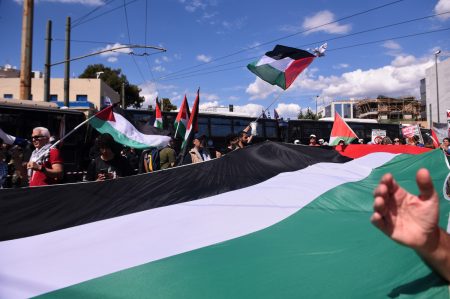 Οι διαδηλωτές συγκεντρώθηκαν στο σταθμό του μετρό «Πανόρμου», και κατυεθύνονται προς την πρεσβεία του Ισραήλ