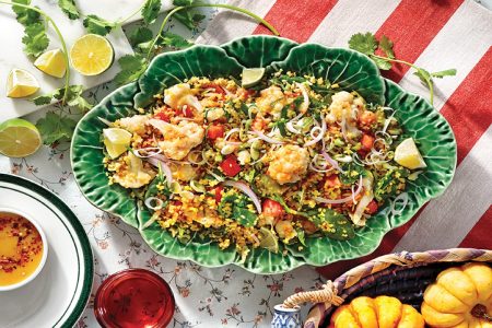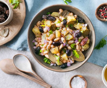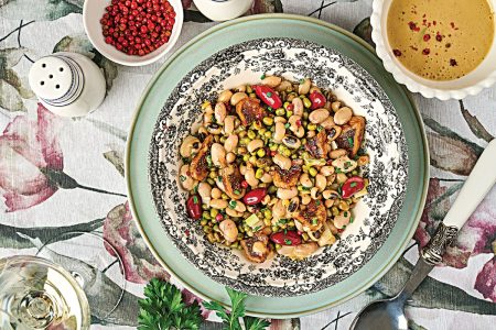 Μια κρύα σαλάτα που συνδυάζει τη γήινη γεύση των οσπρίων με τη γλύκα των ξερών φρούτων και απογειώνεται με τη βινεγκρέτ μελιού, που δημιουργεί ο κορυφαίος σεφ Αθηναγόρας Κωστάκος.