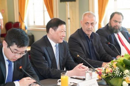 Ο δήμαρχος Πειραιά, Γ. Μώραλης, ο πρώτος σε σταυρούς εκλεγμένος δημοτικός σύμβουλος, Β. Μαρινάκης, μέλη του δημοτικού συμβουλίου και φορείς της πόλης υποδέχθηκαν τη 18μελή αντιπροσωπεία από το δήμο της Σαγκάης, παρουσία της κινέζας Πρέσβειρας στην Ελλάδα, κ. Zhang Qiyue και του προέδρου της Cosco Shipping Group κ. Xu Lirong
