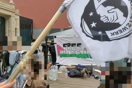 Έξω από το πανεπιστήμιο έχουν συγκεντρωθεί περίπου 60 άτομα, μέλη της οργάνωσης «Πανεπιστημιούπολη Παλαιστίνης».