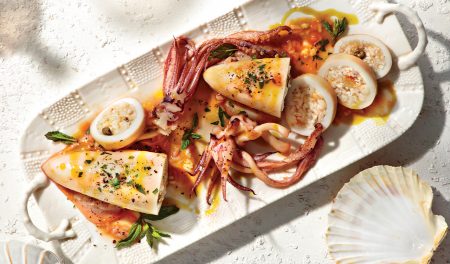 Ένα εκλεπτυσμένο και γευστικό πιάτο που συνδυάζει την τρυφερή υφή των καλαμαριών με μια πλούσια και αρωματική γέμιση και κουβαλάει όλα τα αρώματα του Αιγαίου αφού η συνταγή μας παραχωρήθηκε από την κυρία Νικολέττα, γνήσια τηνιακή.